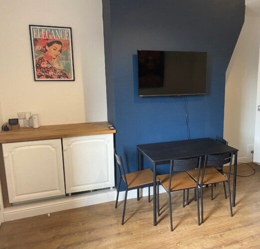 The property has its own dining space. Kitchen is fully kitted with an induction hob and oven, fridge freezer, washing machine, Microwave, kettle and a toaster are also available. All necessary kitchen equipment is provided, such as utensils, cutlery and cookware. There is also an iron and ironing board.
