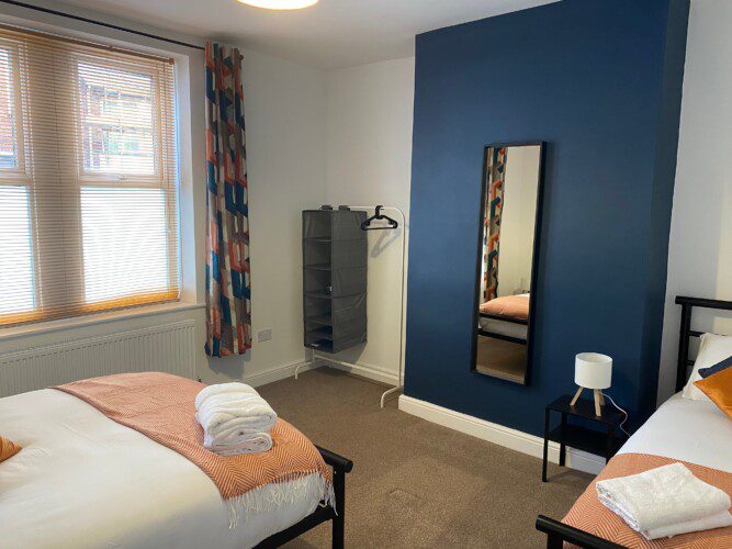 The first bedroom has two single beds, a Wall-mounted wardrobe with hangers, perfect for storage, and a blackout blind at the window.