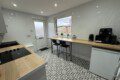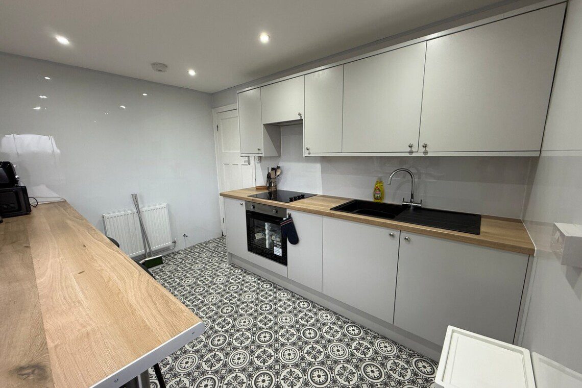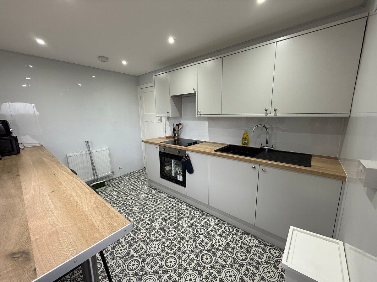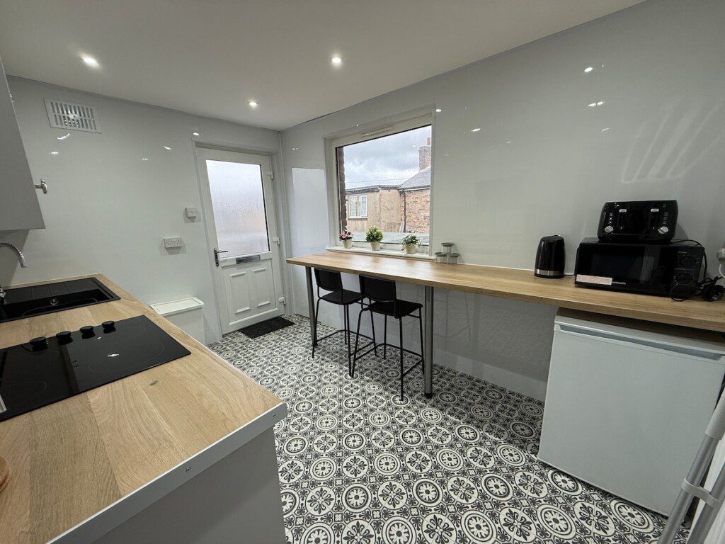 The kitchen is fully equipped with an induction hob and oven, fridge, microwave, kettle, and toaster.