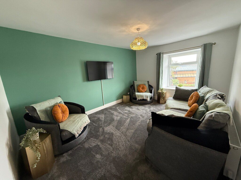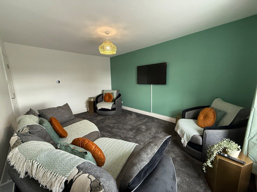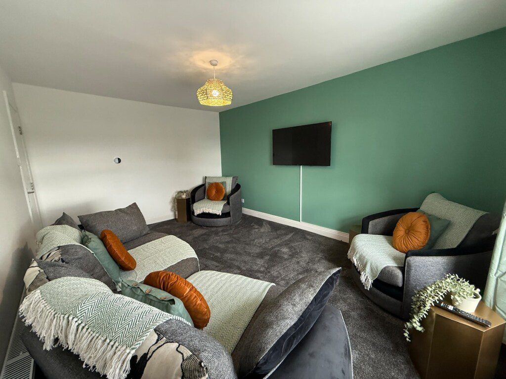 The Living Room has two armchairs and a large sofa, a coffee table, side tables and a Smart TV with Netflix.