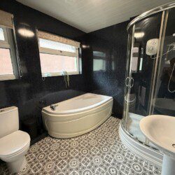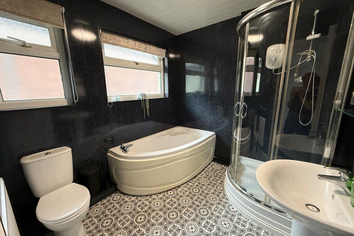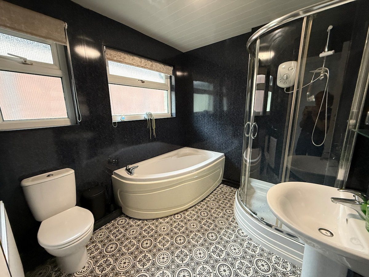 The modern Bathroom upstairs has a bath, a shower with a heater, a toilet, a sink, and a towel radiator.
