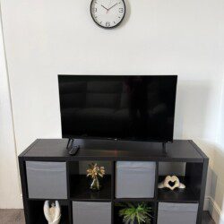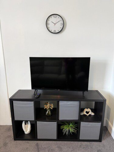 There is a living room where guests can relax, complete with a smart TV.