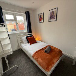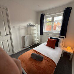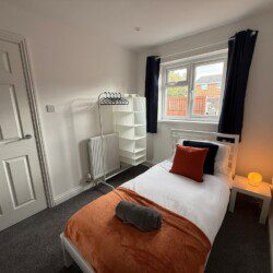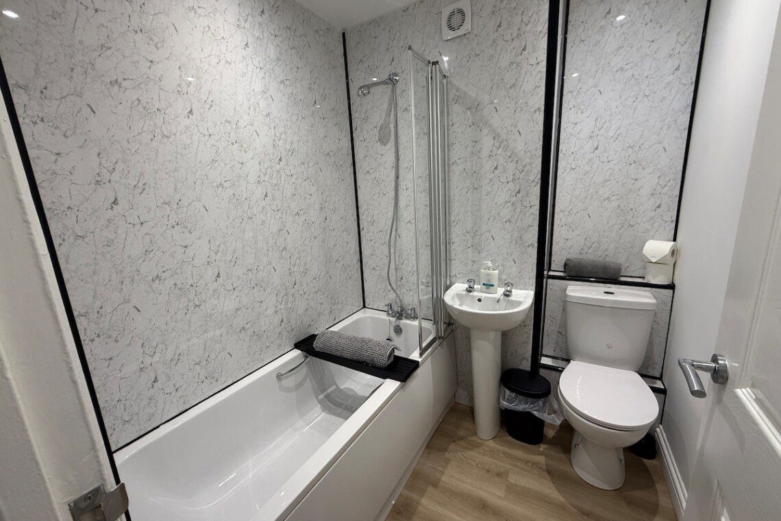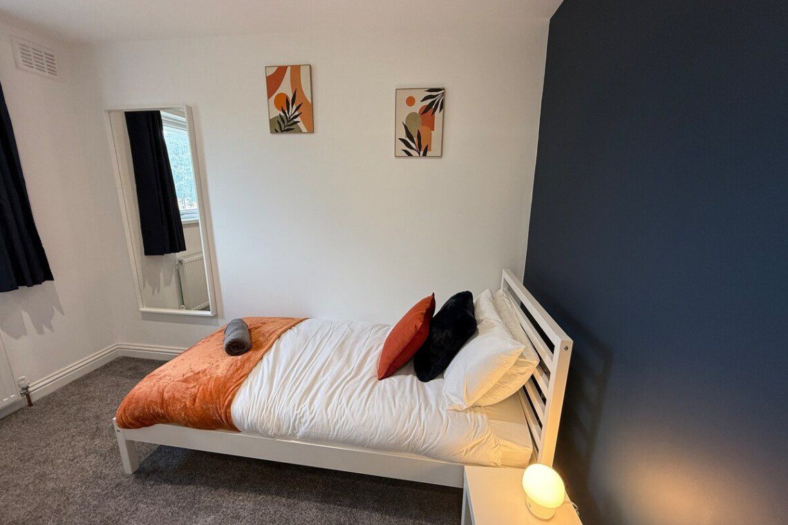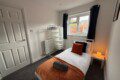 This spacious terraced house is ideal for families, groups, or contractors. With front and back gardens, plus private parking at the rear, it offers both comfort and convenience. The front sits on a peaceful pedestrian street, with access through the rear gate and door. Inside are four bedrooms—three doubles and two singles—along with two bathrooms, one with a shower and one with a bath and overhead shower. A welcoming base for work or leisure.