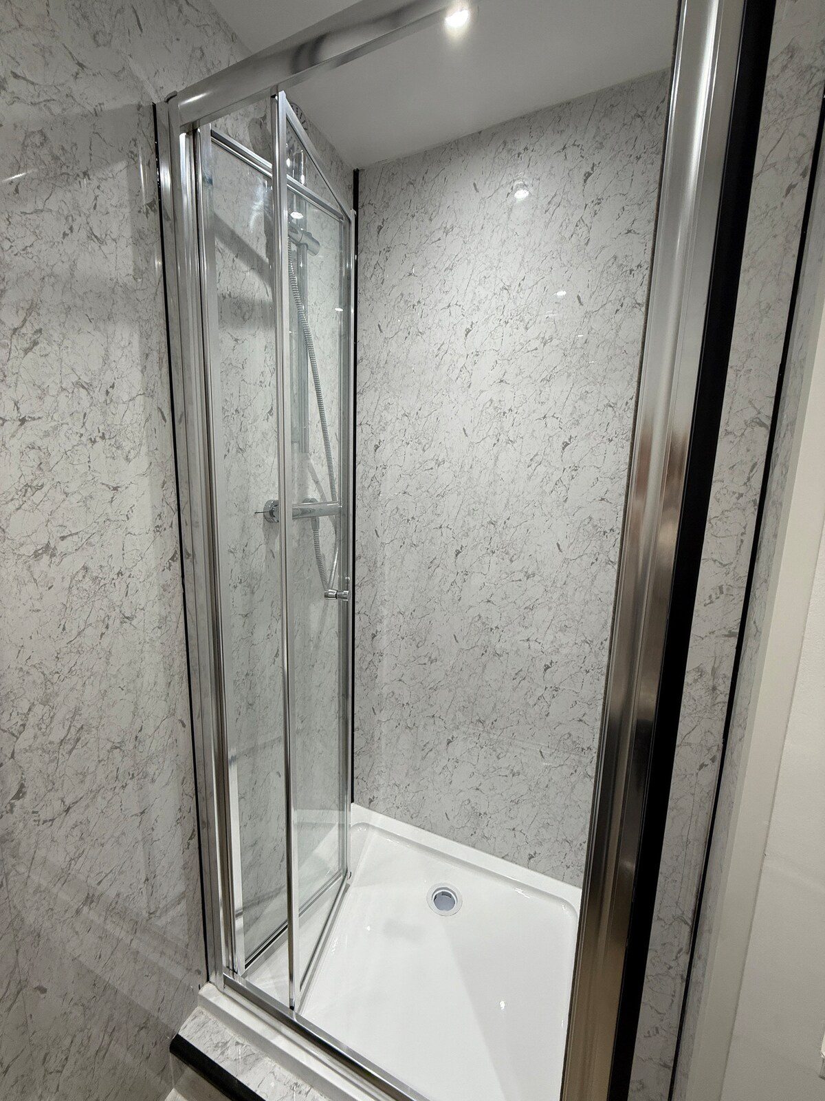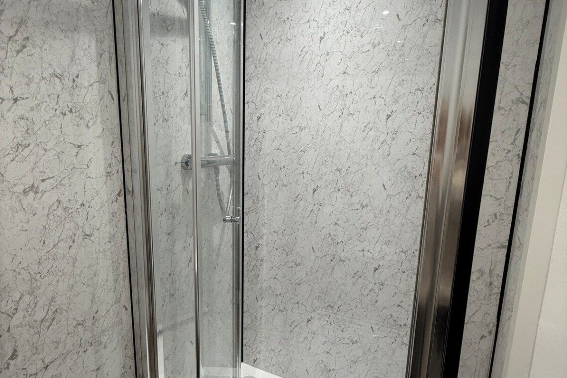 The property has two modern bathrooms. The first includes a bath, a heated shower, a toilet, a sink, and a towel radiator. The second has a heated shower, toilet, sink, and towel radiator as well.